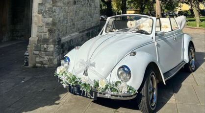 Our 1971 Karmann convertible Beetle, a quirky vintage favorite, seating up to 3 passengers and perfect for whimsical, relaxed events.